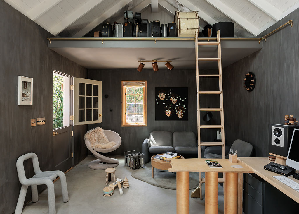 Tucked into the backyard of a 1920s Seattle bungalow, this 300-square-foot ground-up build serves as a private creative sanctuary for a pair of professional musicians. The project demanded a delicate balance: honoring the heritage of the primary home and neighborhood while creating a cozy light-filled acoustic environment.