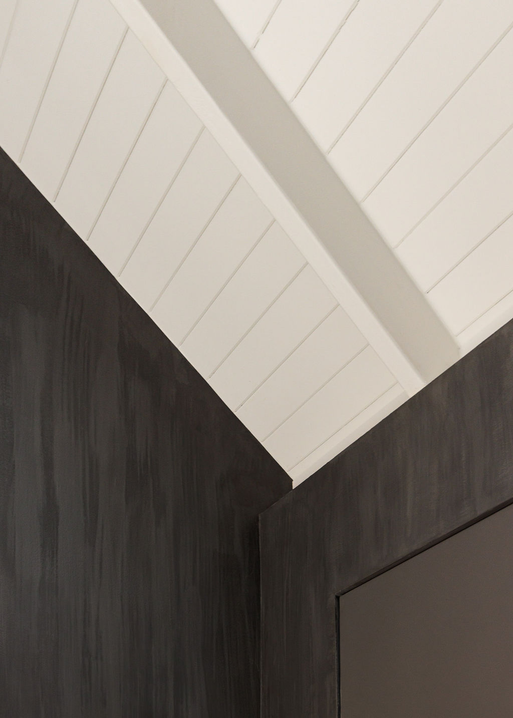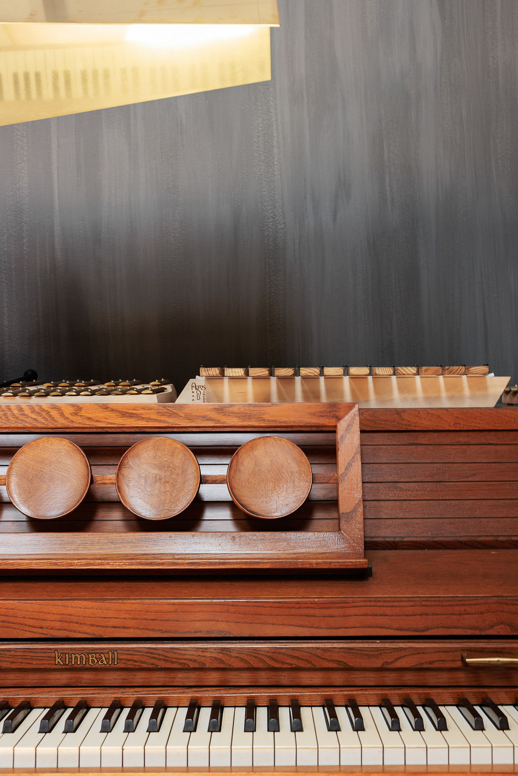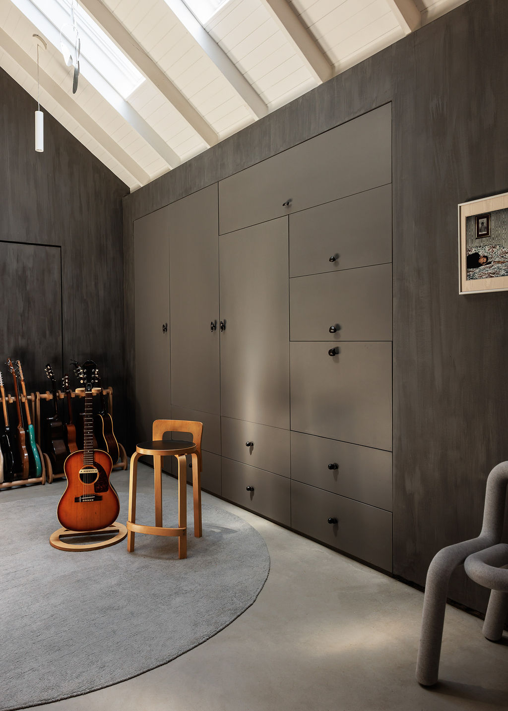 Acoustic Artistry: Walls are finished in a custom hand-applied gray plaster, providing a soft, tactile aesthetic that grounds the space.