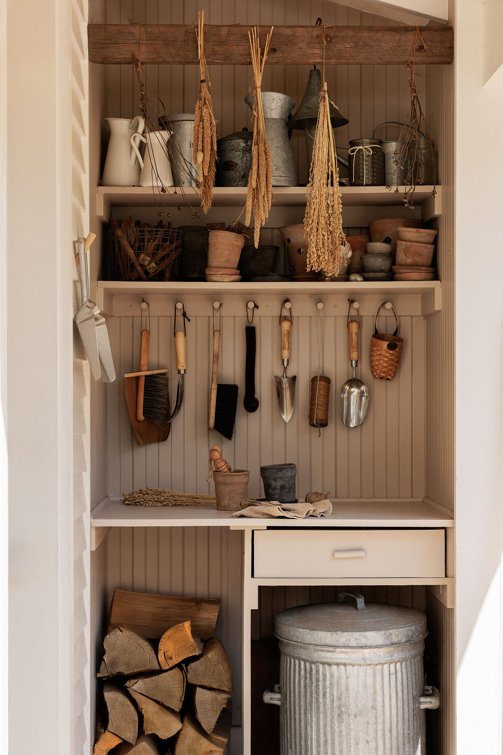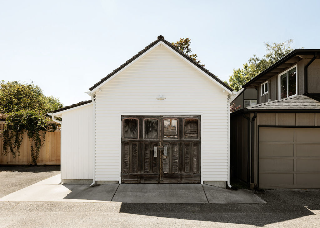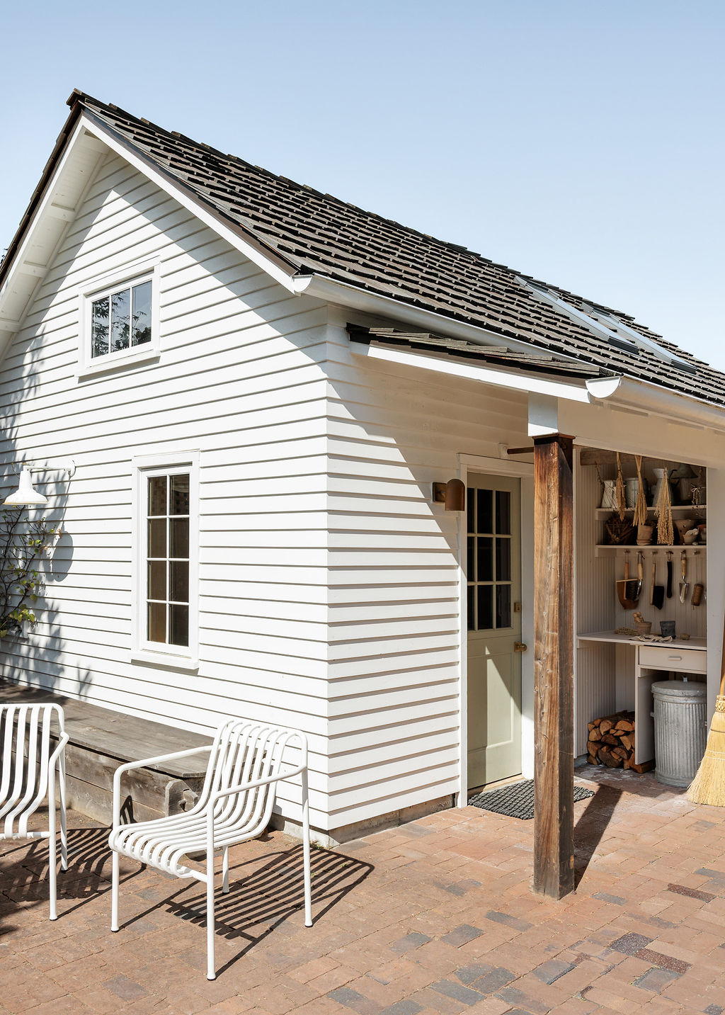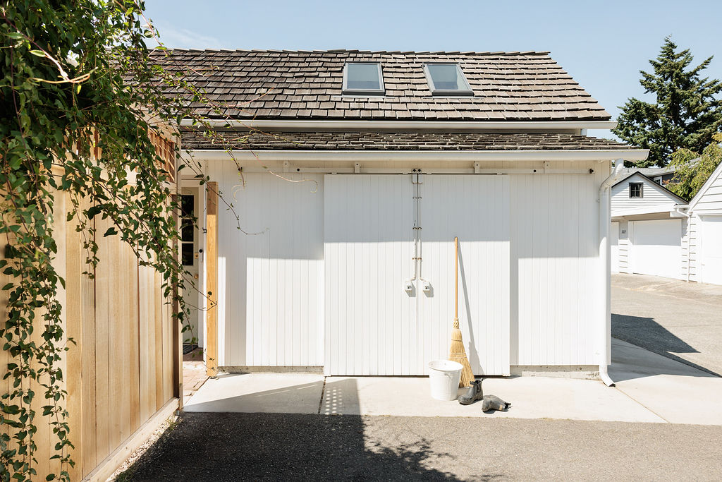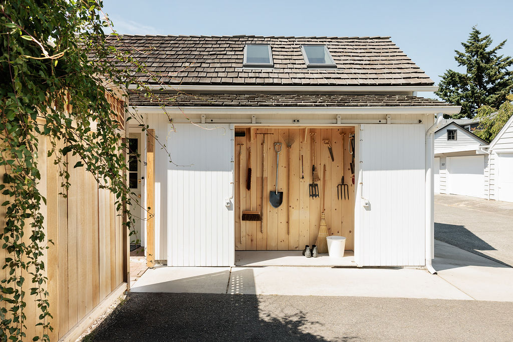 Designed to mirror the original 1920s home, the exterior features period-accurate siding and trim details, allowing it to read as a classic detached garage. To maximize the utility of the backyard, the exterior also incorporates garden tool storage and a dedicated potting station for the family. Inside, the "garage" exterior gives way to a voluminous, light-filled creative suite.